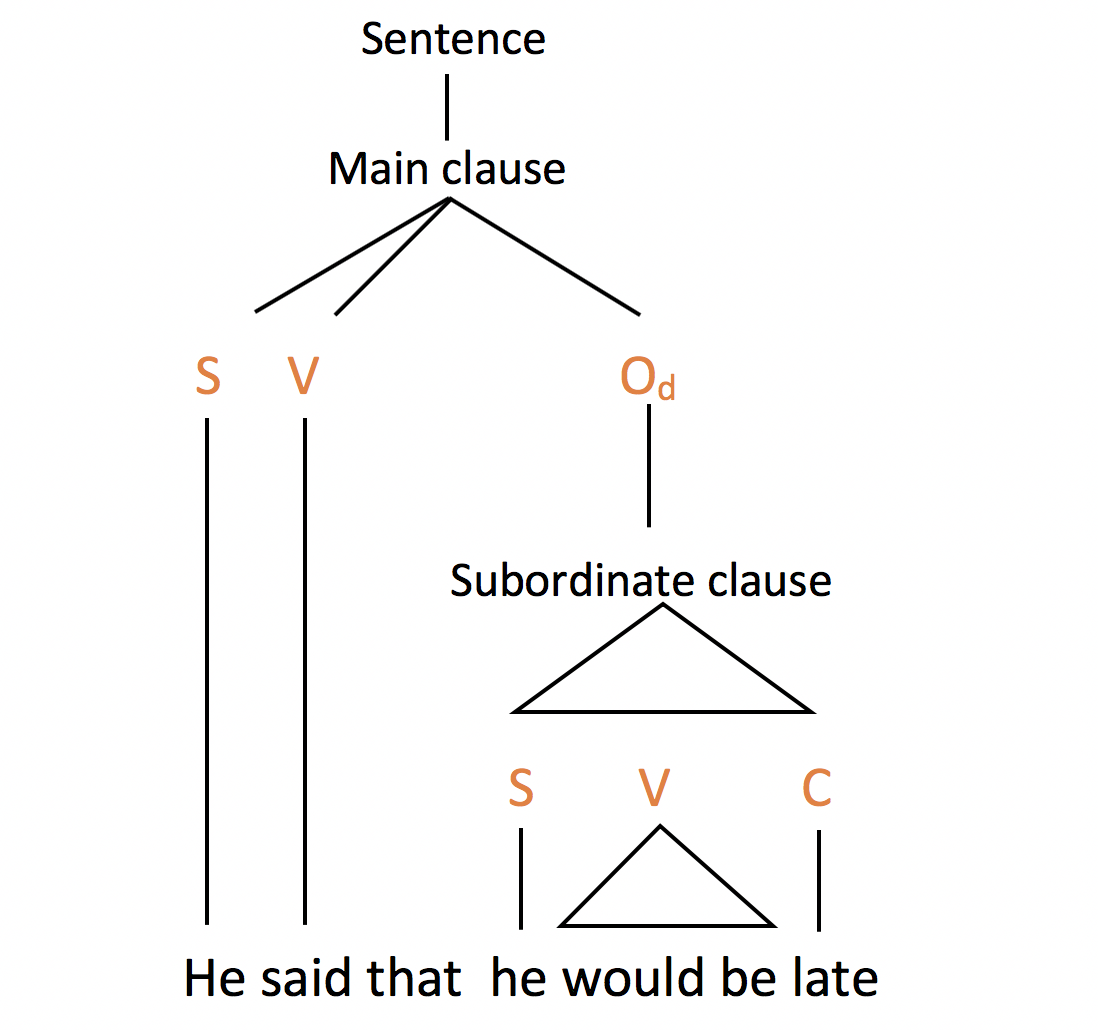 The subordinate clause can expand any element of the main clause apart from the verb . Its grammatical function can be tested by replacing it with a simpler unit such as a noun or an adjective . For example, the sentence He said that he would be late has the same structure as He said something. Therefore the subordinate clause that he would be late, like the indefinite pronoun something, is a direct object .